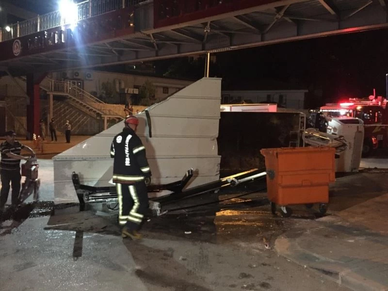 Prefabrik ev taşıyan çekici üst geçide takılarak devrildi