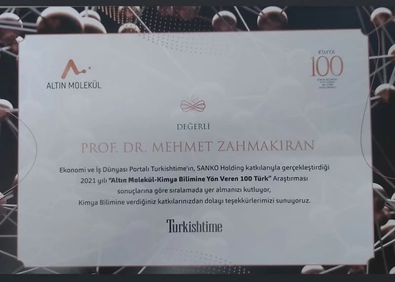 Sanko Holding ve Turkishtime tarafından gerçekleştirilen “Bilimsel Başarı Araştırmasında Kimya Bilimine Yön Veren 100 Türk Araştırmacı” arasına seçilmesini büyük bir mutlulukla öğrendiğini belirten Zahmakıran, “Araştırma grubuma, ortak çalışmalarımızda yer alan akademisyen arkadaşlarıma ve üniversiteme teşekkür ederim” dedi.
