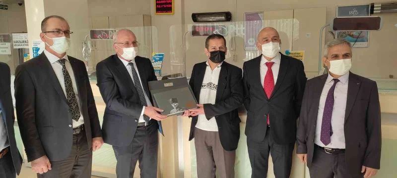 PTT Karabük Başmüdürü Şükrü Elmas, PTT Karabük Merkez Müdürlüğüne gelerek 181. numarayı alan bir kişiye hediye takdim etti.