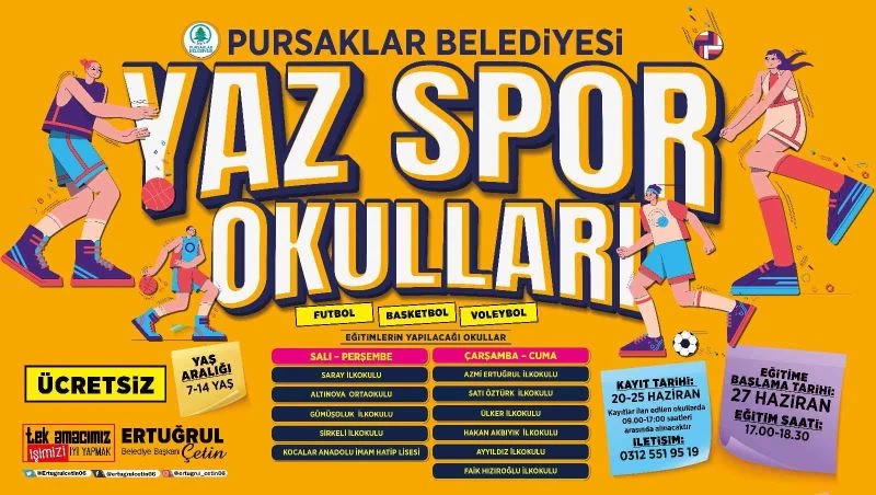 Çocuklara sporun farklı alanlarında gelişim sağlayabilmesi için kurslar veren Pursaklar Belediyesi, yaz tatili boyunca 7-14 yaşları arasındaki çocukların ücretsiz olarak spor yapabilmeleri, hayata sağlıklı ve mutlu hazırlanabilmeleri için Yaz Spor Okulları için kayıtları almaya başladı. Eğitmenler tarafından, salı, çarşamba, perşembe ve cuma günleri; Azmi Ertuğrul İlkokulu, Satı Öztürk İlkokulu, Ülker İlkokulu, Hakan Akbıyık İlkokulu, Ayyıldız ilkokulu, Faik Hızıroğul İlkokulu, Saray İlkokulu, Altınova Ortaokulu, Gümüşoluk İlkokulu, Sirkeli İlkokulu ve Kocalar Anadolu İmam Hatip Lisesi bahçelerinde çocuklara kurslar verilecek.