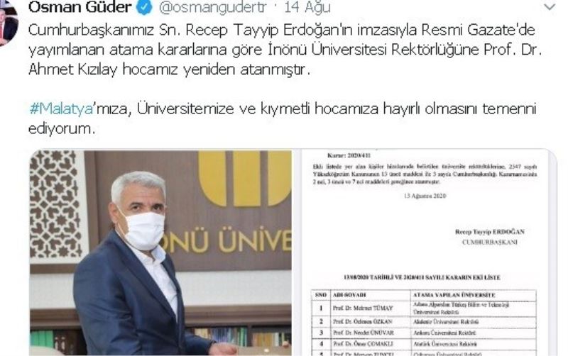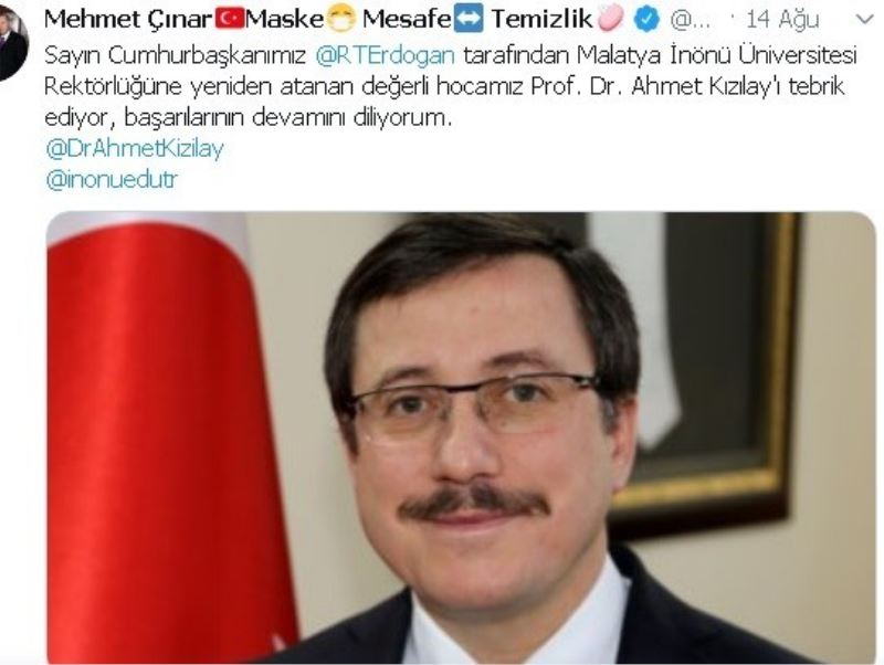 İnönü Üniversitesi Rektörlüğü’nü 4 yıl yaptıktan sonra ikinci dönem için tekrar aday olan ve Cumhurbaşkanı Recep Tayyip Erdoğan tarafından 14 Ağustos 2020 tarihinde tekrar 4 yıllığına ikinci kez rektör olarak atanan Prof. Dr. Ahmet Kızılay için, tebrik eden belediye başkanları arasında Malatya Büyükşehir Belediye Başkanı Selahattin Gürkan, Battalgazi Belediye Başkanı Osman Güder ve Yeşilyurt Belediye Başkanı Mehmet Çınar’da yer alıp, sosyal medya hesaplarında yaptıkları açıklamada, Kızılay’ın tekrar atanmasıyla ilgili memnuniyetlerini dile getirdiler.
