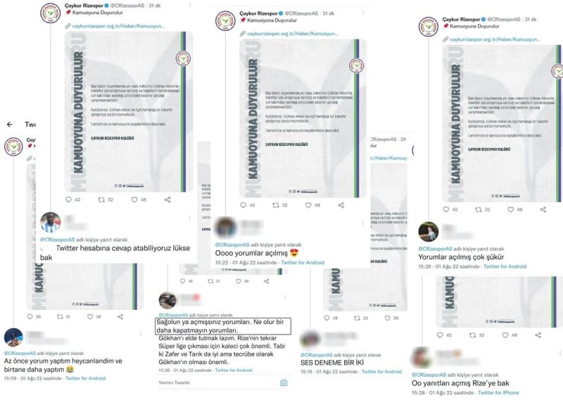 Spor Toto 1. Lig ekiplerinden Çaykur Rizespor’da, kulübün eski başkanı Tahir Kıran ve yönetimi döneminde aldıkları karar ile sosyal medya hesaplarını yoruma kapatmış, bu kararlar ise taraftarlar tarafından tepki ile karşılanmıştı. 20 Haziran 2022’de gerçekleşen kongre ile Kıran yerini İbrahim Turgut’a bıraktı. Yönetiminde de bazı değişiklikler yapan Turgut başkanlığında ki Rizespor’da sosyal medya hesapları uzun bir süreden sonra yeniden yorumlara açıldı. Alınan bu karar ise yeşil-mavili camiayı sevindirdi.