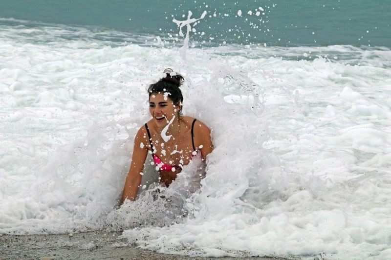 Antalya’da 2 gündür etkili olan sağanağın ardından bugün yağmur yağmayınca dünyaca ünlü sahile gelen Rus kadın, dev dalgaların oluşturduğu köpüklerin arasında denize girdi. Havanın soğukluğuna aldırış etmeyen Rus kadın, “Her gün denize giriyorum ama dün çok büyük dalgalar vardı giremedim. Burada yaşamayı çok seviyorum” dedi.