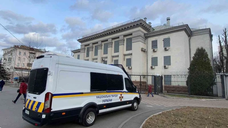 Rusya’nın Ukrayna’daki tüm diplomatik personelini tahliye etmeye karar vermesinin ardından Kiev’deki Rusya Büyükelçilik binasındaki Rusya bayrağı indirildi. Dün gösterilere sahne olan büyükelçilik binasının önünde polis, geniş güvenlik önlemleri alırken, bina çevresinde adeta kuş uçurtulmuyor. Dünkü gösterilerde bina korkuluklarına bırakılan “Cehenneme hoş geldiniz” yazısı ise dikkat çekti.