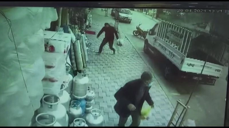 Erzurum’un Narman ilçesinde kaldırımda yürüyen vatandaşlar, fırtına nedeniyle uçan çatının altında kalmaktan son anda kurtuldu.