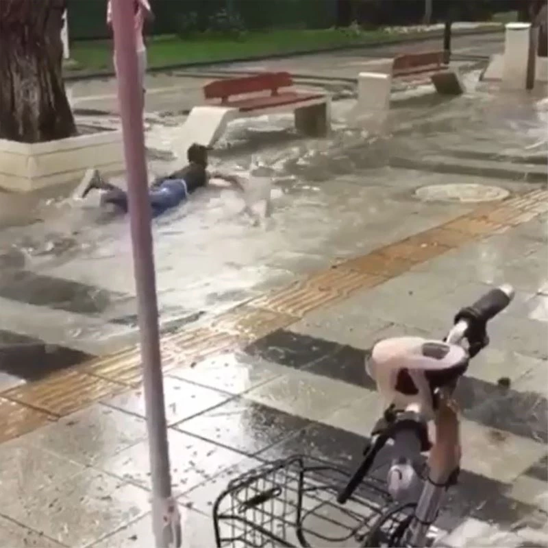 KIRKLARELİ (İHA) – Kırklareli’nde şiddetli yağışın göle çevirdiği caddede bir vatandaşın kulaç atarak yüzmeye çalıştığı anlar ilginç görüntüler oluşturdu.