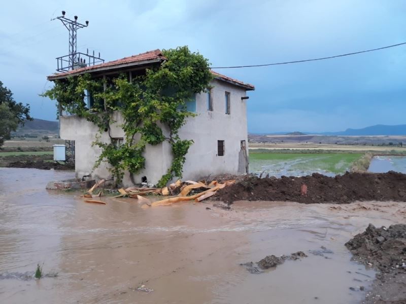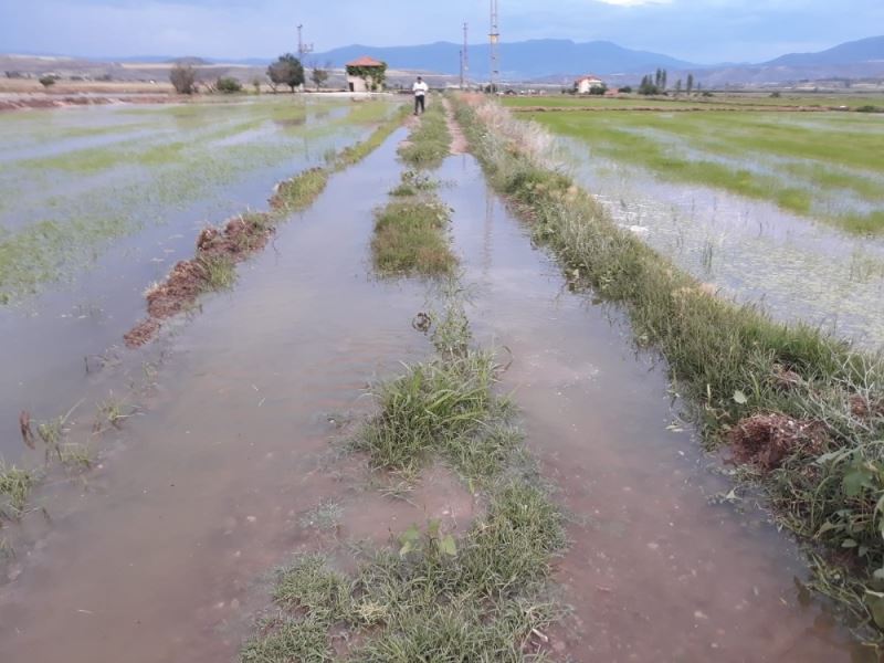 Çorum’un Osmancık ilçesinde etkili olan sağanak yağış çeltik tarlalarına zarar verdi.