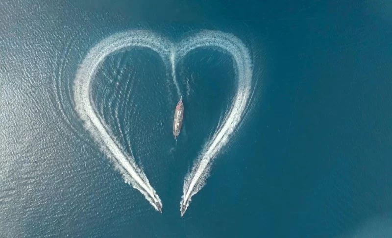 Öte yandan, kaptanlar botlarla denizin ortasına kalp çizdi. Ortasına ise sağlık çalışanlarının olduğu yelkenli tekne durdu.