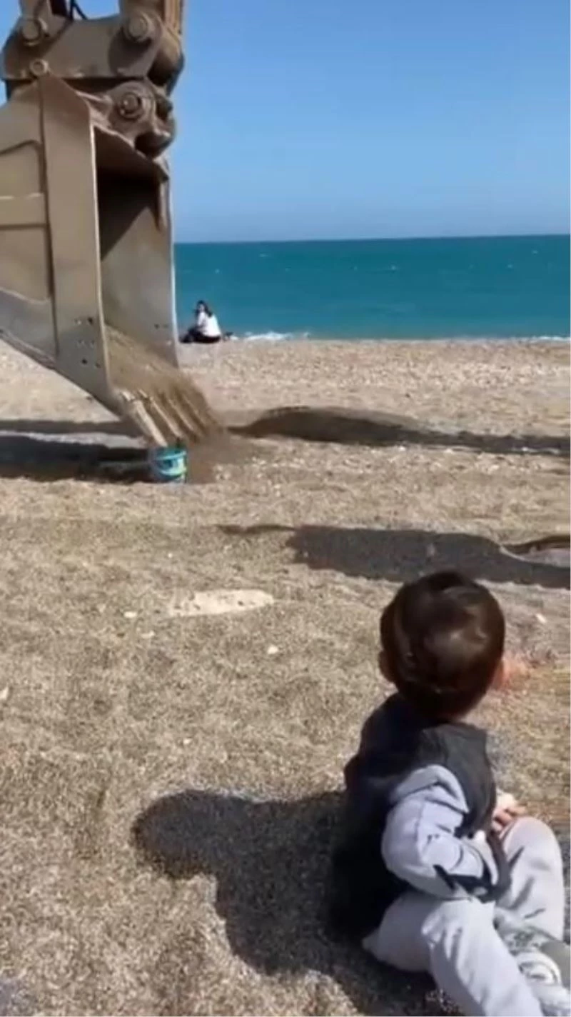 Sahilde oynayan minik çocuğun kum kovasını iş makinesi doldurdu
