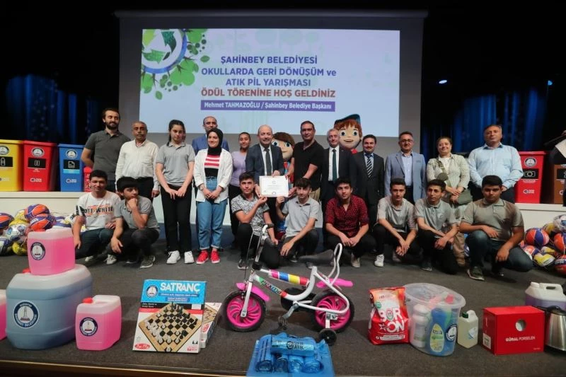 Şahinbey Belediyesi gelecek nesillere daha temiz bir dünya bırakmak adına 5-12 Haziran Dünya Çevre Günü ve Çevre Haftası etkinlikleri çerçevesinde geri dönüşüm ve atık pil toplama yarışmalarında dereceye giren okulları hediye yağmuruna tuttu. Tüm okullara temizlik malzemesi desteğinde bulunan Şahinbey Belediyesi geri dönüşüm projesiyle farklı kategorilerde dereceye giren okullara ihtiyaçlarına göre çeşitli destekler sağladı.