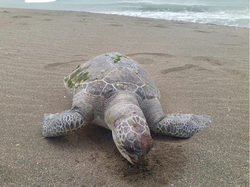 İhbar üzerine bölgeye yönlendirilen belediye ekipleri, öldüğü belirlenen deniz kaplumbağasını kaldırdı.