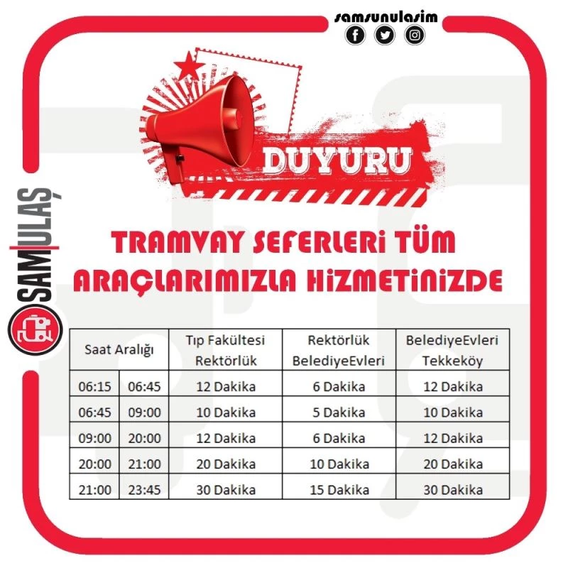 Belediyeevleri-Tekkeköy seferleri 06.15-06.45 12 dakika, 06.45-09.00 10 dakika, 09.00-20.00 12 dakika, 20.00-21.00 20 dakika, 21.00-23.45 saatlerinde 30 dakikada bir yapılacak.