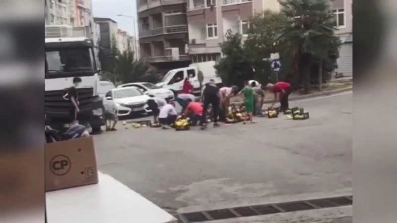 Samsun’da kamyon kasasından düşerek yola savrulan kavunların çevredeki vatandaşların yardımıyla toplanması büyük bir dayanışma örneği oluşturdu.