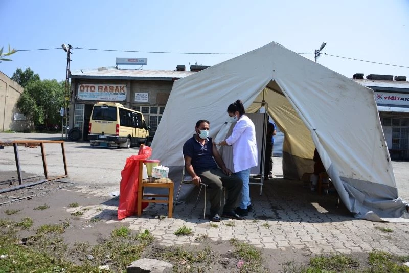 Ardahan’da sanayi çalışanlarının Covid-19 aşısı olabilmeleri için Sağlık Müdürlüğü tarafından aşı çadırı kuruldu. Aşı hizmetinin ayaklarına getirilmesinden memnuniyet duyan esnaf aşı çadırına yoğun ilgi gösterdi.