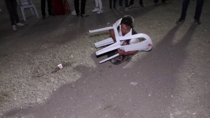 İlçede 15 yıldır davulculuk yapan Faruk Çakmak (37), davul çaldığı düğünde yaptığı sandalye güreşiyle törene damga vurdu. Düğün devam ederken eline aldığı sandalye ile er meydanına çıkarak sandalye ile güreşen Çakmak, davetlileri kahkahaya boğdu. Konuklar bu anı cep telefonları ile ölümsüzleştirdi.