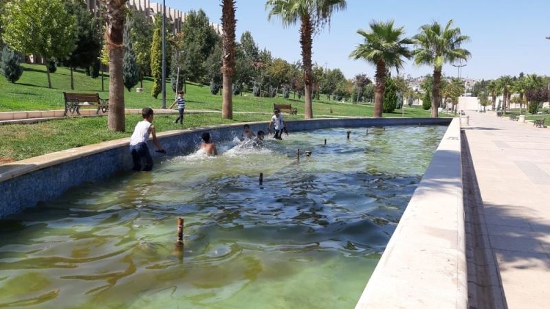 Şanlıurfa’da 47 dereceye ulaşan hava sıcaklığı nedeniyle vatandaşlar gölgelik alanlarda serinlemeye çalışırken, çocuklar ise süs havuzlarında oynayarak serinliyor.