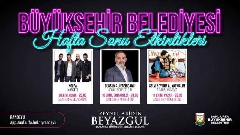 9 Ekim Cuma akşamı saat 20.00’de Şanlıurfa Müzesi önünde ’Açık Hava Otomobil Konseri’ ile Kolpa Grubu yeni normal standartlarına uygun şekilde Şanlıurfalılarla buluşuyor. 10 Ekim Cumartesi akşamı saat 20.00’da ’Şanlıurfa Edebiyat Günleri’ etkinliği kapsamında aynı mekanda Dursun Ali Erzincanlı ’Gönül Sohbetleri Gecesi’ düzenlenecek. 11 Ekim Pazar akşamı saat 20.00’da ise ’Arabada Açık Hava Sinema Etkinliği’nde ’Selvi Boylum Al Yazmalım’ nostalji sinema filmi Şanlıurfalılara izlettirilecek.