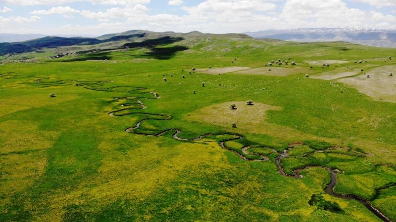 Muş’un Varto ilçesine bağlı 2 bin 149 rakımda bulunan Ünaldı köyü yakınında sarı çiçeklerle birleşen menderesler kartpostallık görüntüler oluşturuyor.