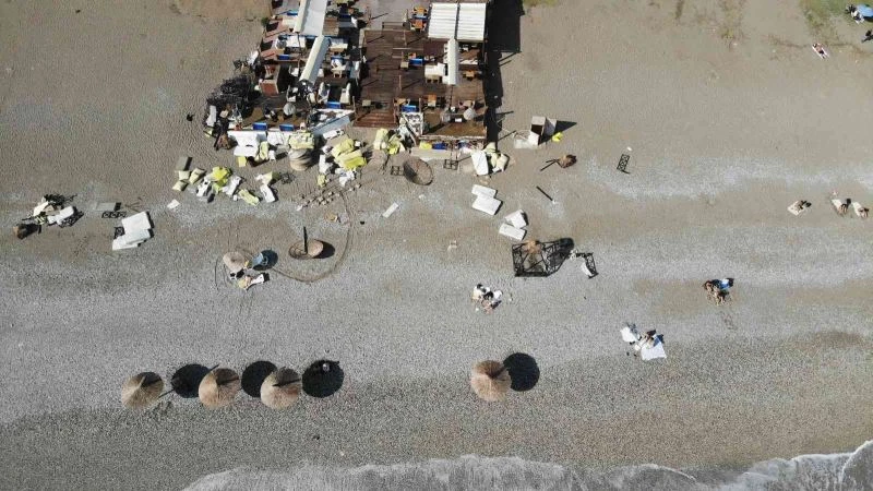 Diğer taraftan sahile gelen Antalya Büyükşehir Belediyesi ekipleri ise sahilde sezonun kapanması ile birlikte kilometrelerce uzanan yüzme kulvarı ipini topladı. Ekipler ayakta kalan cankurtaran kulelerini de kepçe ile kaldırarak kıyıya taşıdı. Vatandaşlar ekiplerin sahilde kepçe ile yaptığı çalışmaları izledi. Bir vatandaş ise yanına aldığı altın arama detektörü ile sahile gelerek kum altında değerli mücevher aradığı görüldü. Öte yandan deniz üzerinde oluşan kirlilik ve adeta savaş meydanına dönen sahil havadan drone kamerası ile de görüntülendi.