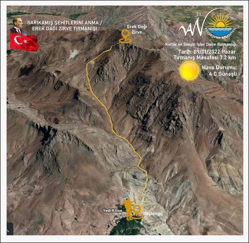 Van Büyükşehir Belediyesinden yapılan açıklamada, Kültür Sosyal İşler Dairesi Başkanlığı kültür ve doğa yürüyüş etkinlikleri kapsamında 9 Ocak Pazar günü Sarıkamış şehitlerini anmak için 3 bin 204 metre yüksekliğindeki Erek Dağı’na tırmanış düzenleneceği belirtildi. Açıklamada, “Sabah 03.00’te başlayacak olan tırmanış, 17.00’de son bulacak. Tırmanışa teknik araç gereç ve giyime sahip ve kış dağcılığı eğitimi bulunan kişiler katılım sağlayabilecek. Etkinlik 20 kişi ile sınırlı olacak. Tırmanış etkinliğine katılmak isteyen dağcılar kayıtlarını Büyükşehir Belediyesi Kültür ve Sosyal İşler Dairesi Başkanlığından yapabilir” denildi.