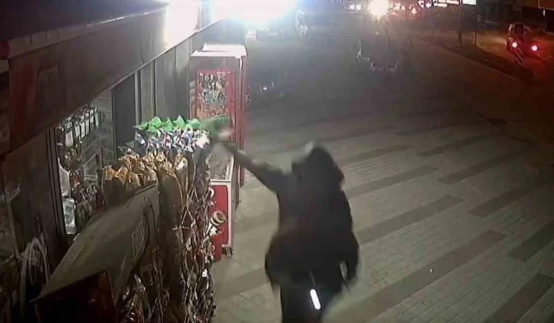 Bursa’nın İnegöl ilçesinde scoterlı gençlerin market önündeki raftan cips çalma anı kameraya yansıdı.