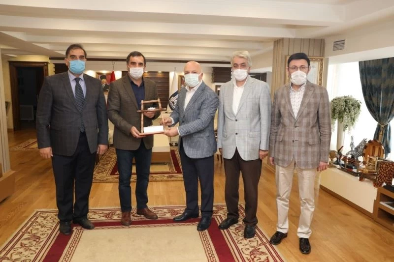 Görüşmede Başkan Mehmet Sekmen’e ŞEHİRDER üyesi Ahmet Çakır’ın el emeği ile yaptığı yol temalı ahşap plaket takdim edildi.