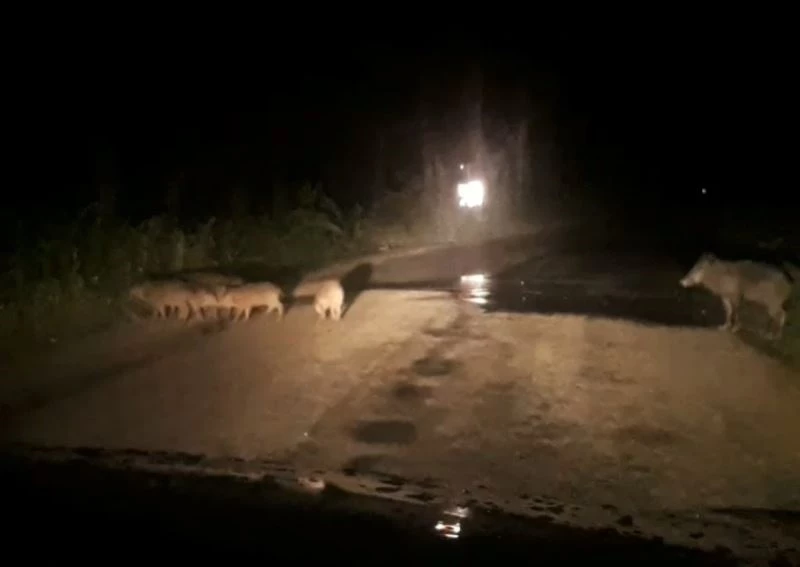 İnegöl’den Ortaköy Mahallesi’ne seyir halinde olan sürücü Gülsüm D.’nin aniden önüne domuz ve yavrularından oluşan sürücü çıktı. Domuzları gören Gülsüm D., aniden frene basarak durdu. Kadın sürücü, domuz sürüsünün yoldan karşıya geçmesini dakikalarca beklerken, o anları da görüntüledi.