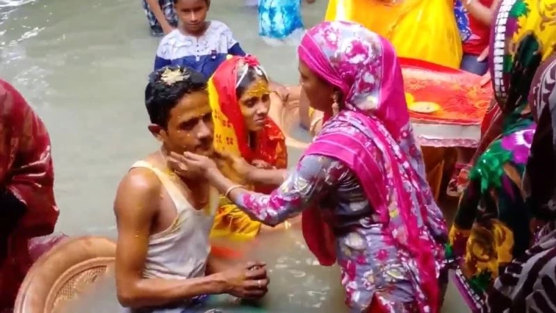 Bangladeş’te son 3 aydır devam eden Muson yağmurları ülke genelinde birçok yerde sele neden oldu. Yaklaşık 360 nehrin bulunduğu ülkenin birçok şehrinde nehir suları tehlike noktasını aşarak yaşam alanlarına girdi. Meydana gelen sel nedeniyle bölgedeki vatandaşlar günlerdir evde hapis hayatı yaşayarak oldukça zor günler geçiriyor. Sel sebebi ile günlerdir dışarıya çıkamayan insanlar, nikah, düğün, cenaze gibi toplu törenleri de yapamıyor. Ülkenin güney bölgesinde yer alan Bengal Körfezi’nin yanında yaşayan bir çifte ise sel suları engel olamadı. Çift, bel seviyesine çıkan sel sularının içinde kına törenlerini gerçekleştirdi. Yaşam alanlarına sel suyunun girmesi sebebiyle kına kutlamasını sürekli erteleyen çift, en sonunda aldıkları kararla suyun içine sandalyeler yerleştirip oturdu ve kına törenlerini yaptı. Henüz isimleri bilinmeyen ancak suda yaptıkları kınayı sosyal medyada paylaşan çift, çok sayıda tebrik mesajı aldı. Çiftin kına merasimine akraba ve komşuları da katıldı.