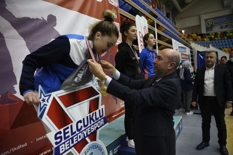 Türkiye Taekwondo Federasyonu’nun 2022 faaliyet programında yer alan Türkiye Büyükler Taekwondo Şampiyonası, 18-22 Ocak tarihleri arasında Selçuklu Belediyesinin ev sahipliğinde Uluslararası Spor Salonunda düzenlendi. 73 ilden 632 kulübe bağlı 1559 sporcunun mücadele ettiği ve birbirinden zorlu müsabakalara sahne olan şampiyonada Selçuklu Belediyespor’un Milli Sporcusu İkra Kayır 62 kiloda Türkiye Şampiyonu oldu. Rakiplerini çok rahat bir şekilde mağlup ederek altın madalyanın sahibi olan Kayır, müsabakaların ardından düzenlenen törende madalyasını Selçuklu Belediye Başkanı Ahmet Pekyatırmacı’nın elinden aldı. Madalya töreninde Başkan Pekyatırmacı’nın yanı sıra Türkiye Taekwondo Federasyonu Başkanı Prof. Dr. Metin Şahin, Selçuklu Belediye Başkan Yardımcısı Mehmet Ali Çakar, Selçuklu Belediyespor Kulübü Başkanı Mustafa Yavuz Tezcan da yer aldı.