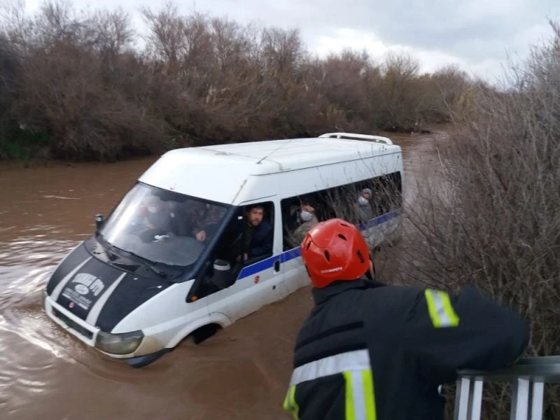 Selde mahsur kalan minibüs içerisindeki 9 kişi merdivenle kurtarıldı