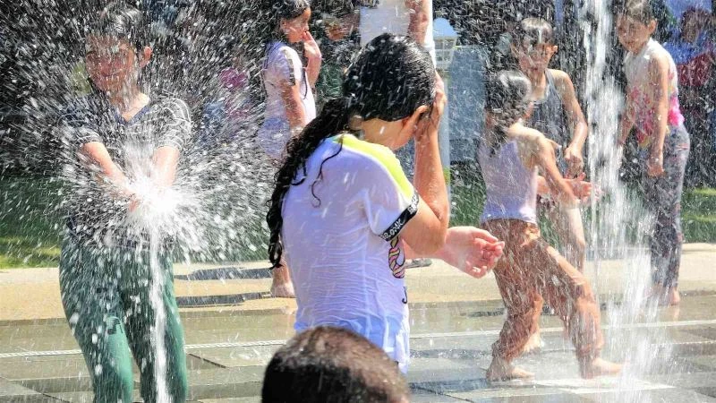 Tokat’ta sıcaktan bunalan çocuklar şehir parkında fıskiyelerin altına girerek serinledi.