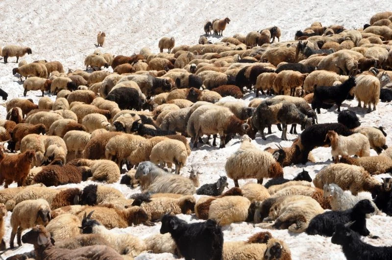Haziran ayının son günlerinde hava sıcaklığının artması insanlar kadar hayvanları da etkiledi. 3000 rakımlı Terazin Yaylası’nda otlanan hayvanlar, havaların sıcak olması nedeniyle çobanlar tarafından karlı yamaçlara getiriliyor. Sabah saatlerinde merada koyunları otlatan çoban, öğle saatlerinde sıcak havadan dolayı koyunları karın bulunduğu bölgeye getirerek doğal olarak serinlemelerini sağlıyor.