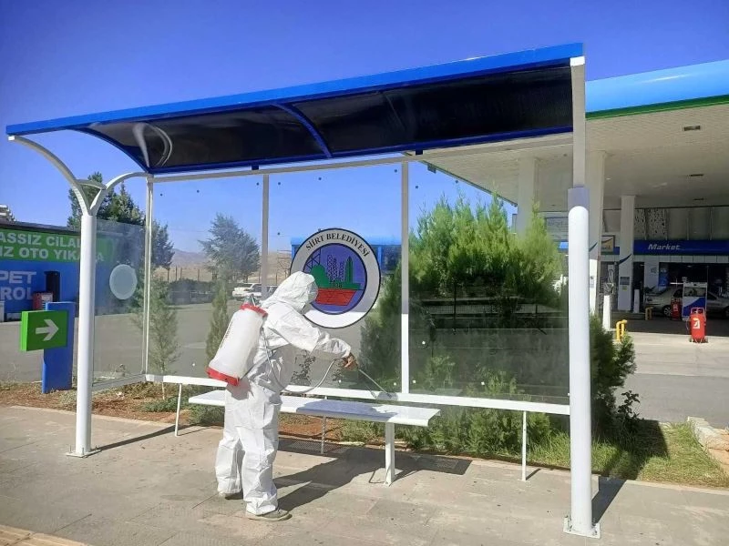 Siirt Belediyesi Temizlik İşleri Müdürlüğü İlaçlama Birimi ekipleri, korona virüs (Covid-19) tedbirleri kapsamında otobüs duraklarını dezenfekte etti.