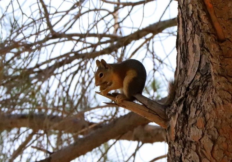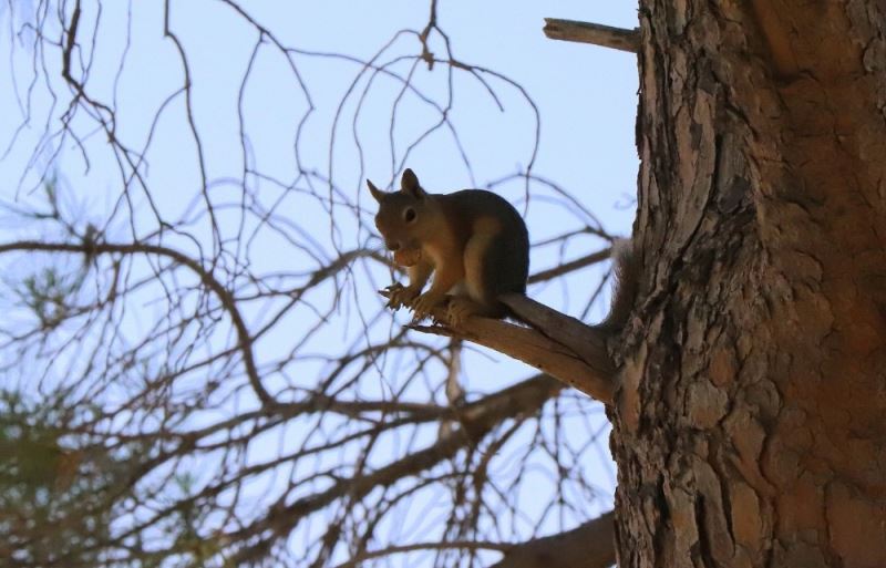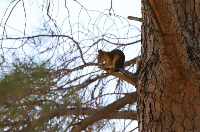 Manisa’nın Saruhanlı ilçesinde bir sincabın, çam ağacının dalında yemek yediği anlar objektiflere takıldı.