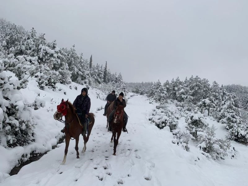 Atlara binen ekip Asar tepesine tırmandı, türküler söyleyerek karın keyfini sürdü. Doğa turizmi ile ön plana çıkan Sındırgı’nın bir ucu bin 765 metre yükseklikteki Ulus zirvesinde off roadçular da kar keyfini farklı boyutta yaşadı.