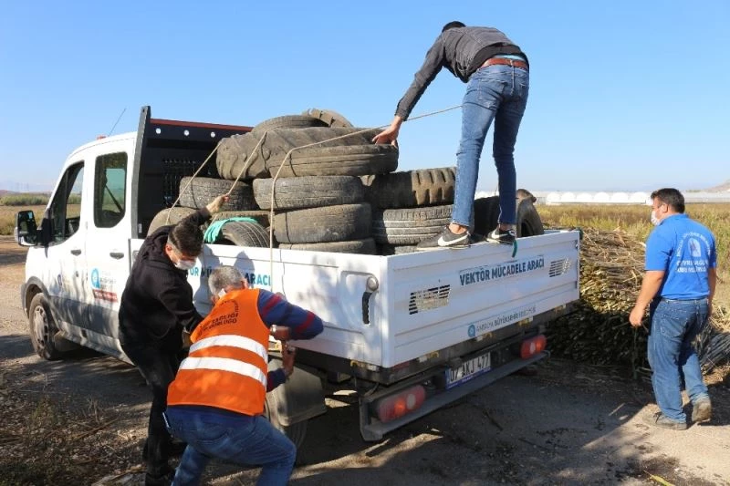 Serik’te sivrisinekle mücadele çalışmalarını kapsamında sinek üremesine ortam oluşturan atık lastikler toplanarak geri dönüşüme kazandırılıyor
