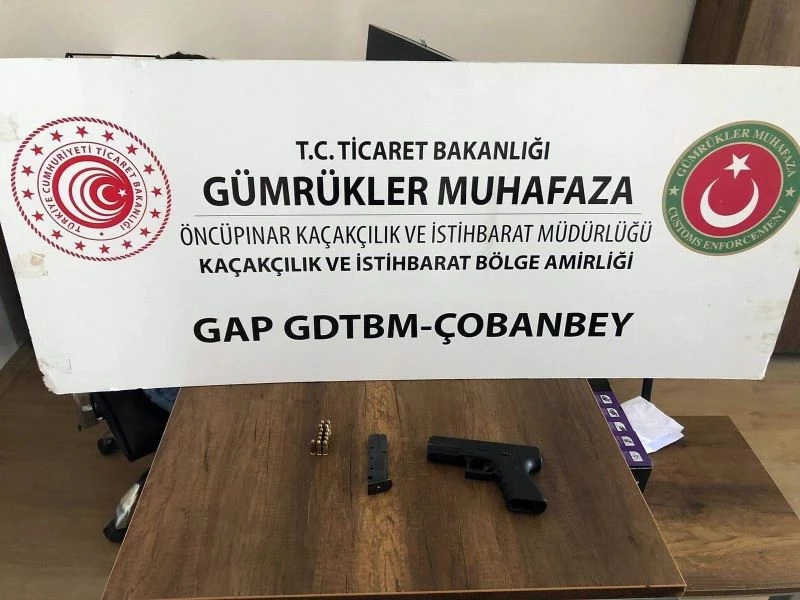 Edinilen bilgiye göre, Elbeyli Çobanbey Gümrük Muhafaza Kaçakçılık İstihbarat Bölge Amirliği ekipleri, Suriye’den Türkiye’ye girmek üzere yabancı uyruklu bir kişinin eşyalarında yapılan kontrollerde kıyafetleri arasına gizlenmiş vaziyette bir adet tabanca, 13 adet mermi ve 4 bin 100 karton sigara ele geçirildi. Yabancı uyruklu kişi hakkında Kilis Cumhuriyet Başsavcılığı tarafından soruşturma başlatıldı.