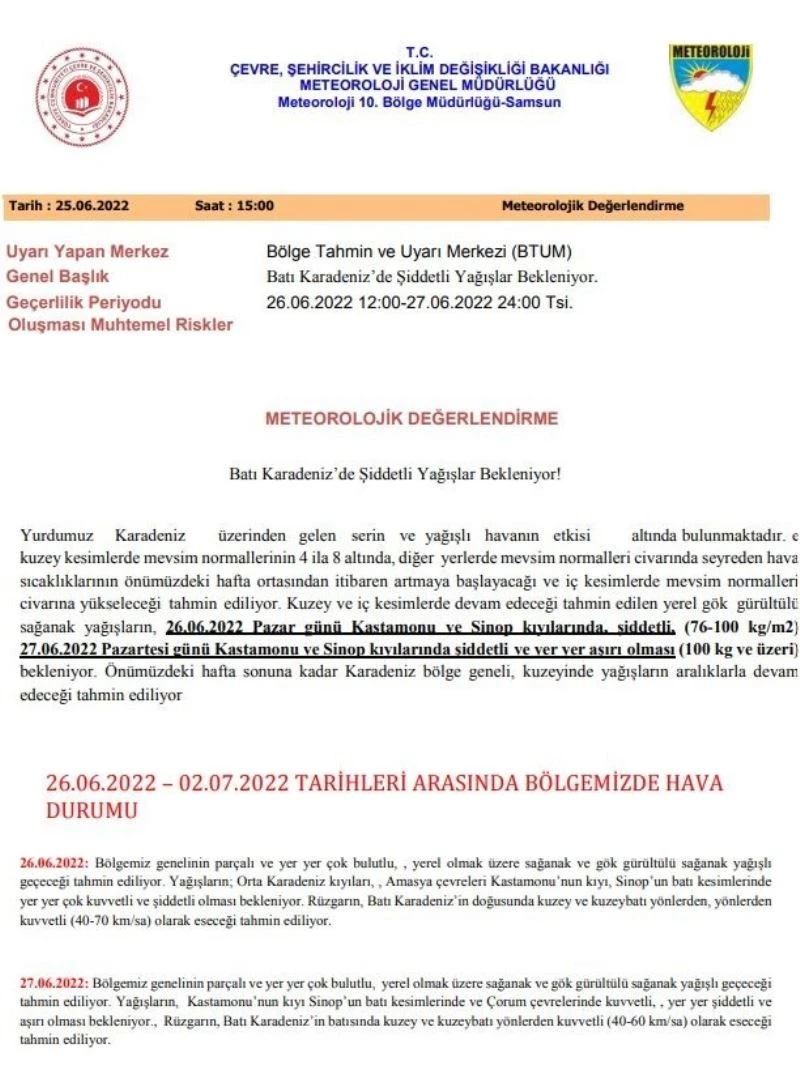 Meteoroloji 10. Bölge Müdürlüğü’nden yapılan açıklamaya göre, Batı Karadeniz’de şiddetli yağışlar beklendiği belirtildi. Pazar günü Kastamonu ve Sinop kıyılarında yağışların metrekareye 76-100 kilogram arasında, pazartesi ise 100 kilogramın üzerinde yağış geleceği tahmin ediliyor.