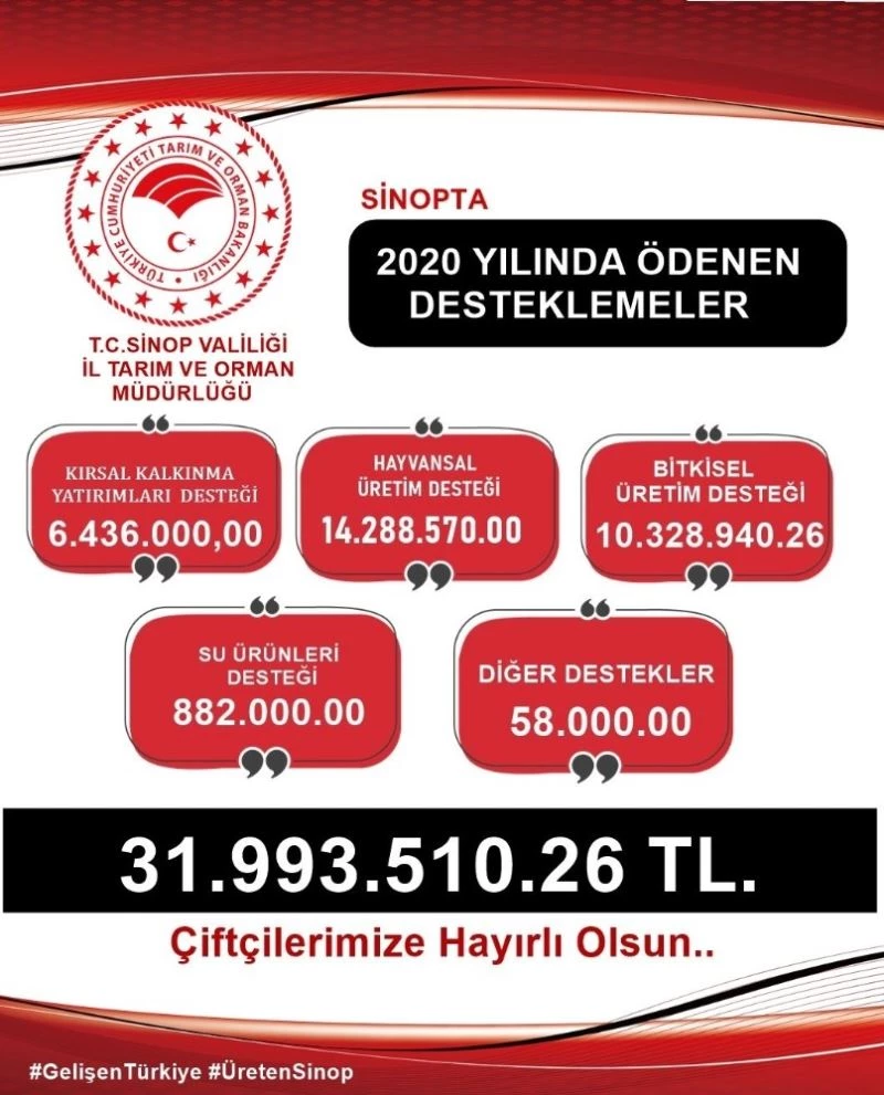 Sinop İl Tarım ve Orman Müdürlüğü tarafından yapılan açıklamaya göre, çiftçilere 6 milyon 436 bin TL ‘kırsal kalkınma yatırımları desteği’, 14 milyon 288 bin 570 TL ‘hayvansal üretim desteği’, 10 milyon 328 bin 940,26 TL ‘bitkisel üretim desteği’, 882 bin TL ‘su ürünleri desteği’ ve 58 bin TL ‘diğer destekler’ adı altında 2020 yılında toplam 31 milyon 993 bin 510,26 TL destekleme ödemesi yapıldı.