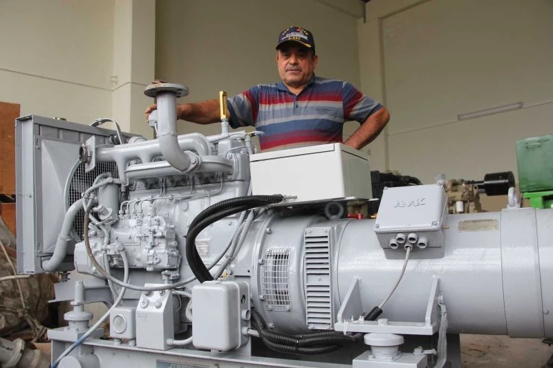 Traktör motorlarını da jeneratöre çevirdiklerini belirten Uğur Kalemtaş, “Şimdi depoda yeni makinelerimiz var. Sandık içinde yeni geldi. Bunlar mesela 55 beygir traktör motoru. Biz onları jeneratöre çeviriyoruz. Biz bunları alıyoruz gücüne göre jeneratör bağlıyoruz. Bunları ekonomiye kazandırıyoruz. 60 beygir motor mesela arkasında 35 kw dinamo takıyoruz. Bunları da kayıklarda, sanayide, her yerde, otellerde kullanabiliyorsun. Elektrik kesildiğinde otomatik devreye giriyor o sistemi de yapabiliyoruz. 35 kw jeneratörümüz şu anda fiyatı 25 bin TL ama komple yeni almaya kalksan 60 bin TL gerekir. Arkada 150 kw jeneatörümüz var. Onun da maliyeti 50 bin TL. Bunları hep kayıklarımız kullanabiliyor. Eskiden kara düzen devam ediyordu şimdi hep elektrik oldu hidrolik oldu. Elektrik motorlarıyla beraber çalışıyor” şeklinde konuştu.