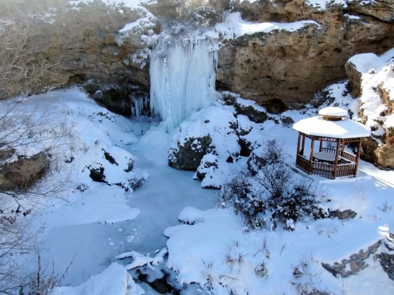 Bayburt’ta, Divanyolu Dağları ile Kırklar Tepe eteklerinden doğduktan sonra Kopuz Deresi’nden yaklaşık 20 metreden dökülen Sırakayalar Şelalesi buz tuttu.