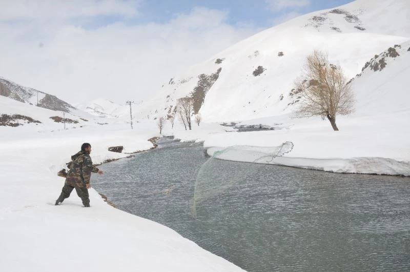 Şırnak’ta donan dere yatakları çözülünce vatandaşlar buz gibi suda balık avına çıktı