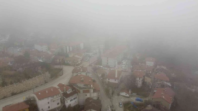 Bolu’nun Mudurnu ilçesinde etkili olan sis dron ile havadan da görüntülendi.