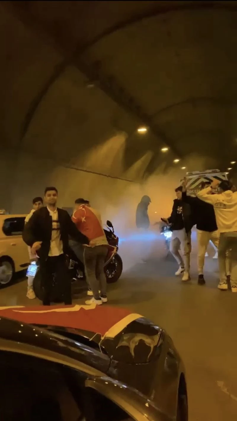 Şişli Dolmabahçe Tüneli’nde asker uğurlamak için konvoy yapan şahıslar, tüneli kapatıp yolu trafiğe kestiler. Tünelde dans eden geçler motosikletle patinaj çekip tüneli dumana boğdu. O anlar cep telefonu kamerasına yansıdı.