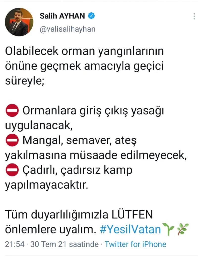 Sivas Valisi Salih Ayhan resmi sosyal medya hesabından yaptığı açıklamada, “Olabilecek orman yangınlarının önüne geçmek amacıyla geçici süreyle; ormanlara giriş çıkış yasağı uygulanacak. Mangal, semaver, ateş yakılmasına müsaade edilmeyecek. Çadırlı, çadırsız kamp yapılmayacak. Tüm duyarlılığımızla lütfen önlemlere uyalım” ifadelerini kullandı.