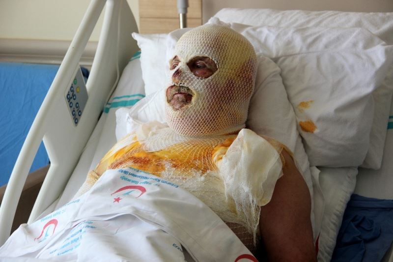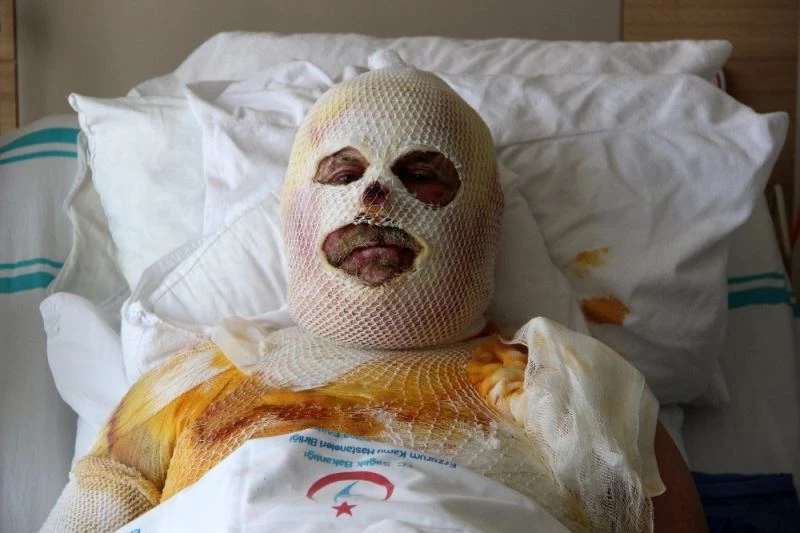 Alevler parlayınca ilk olarak göğsünün tutuştuğunu ifade eden Kadim Ercan, “Çıldır’ın Kayabeyi köyüne tatile gittik. Soba çayı yapalım dedik. Sabah erken saatte sobanın yanında duran benzini ağaç parçasının üstüne dökerek sobanın içinde ateşledim. Kalan benzinde plastik şişede masanın üstündeydi. Soba alevlenince şişeye de alevlendi. Üstüme sıçradı, üstüm tutuştu. Şişeyi attım atmasam ev de yanacaktı. Bağırdım, eşim içerideydi geldi. Köy muhtarı karşıdan görmüş geldi, söndürdüler. İlk göğsüm tutuştu, pijamalar vardı üzerimde. Karşı evden köy muhtarı bağırmamı duymuş geldi tişörtünü çıkartarak alevlere vurdu. Hanım kovalarla su döktü, söndürdüler. İlk Ardahan Devlet Hastanesine gittik sonra buraya sevk ettiler” diye konuştu.
