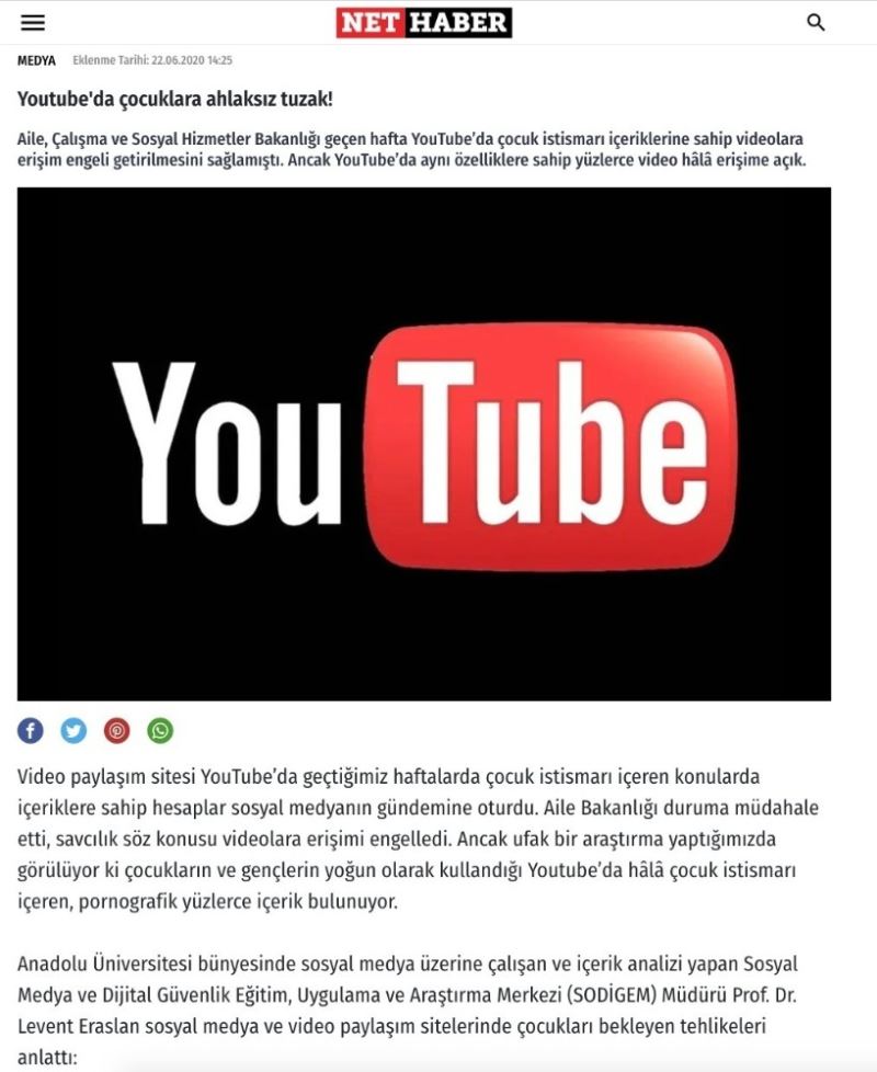 Türkiye’de neredeyse 4.5 milyon çocuk ve genç abonesi bulunan bu kanallara yönelik SODİGEM tarafından yapılan bilgilendirici çalışma, ulusal basında kendine çokça yer buldu. Hürriyet Gazetesi ve ülkenin önde gelen pek çok ulusal gazetesinin manşetinde “Çocuklara derin tuzak” ve Sosyal rezillik” gibi başlıklar atılarak yayınlanan haberin içeriğinde SODİGEM uzmanları tarafından ailelere verilen tavsiyelere yer verildi. SODİGEM tarafından toplumsal fayda gözetilerek yapılan bu çalışma yazılı basının yanı sıra bazı TV kanalların haber bültenlerinde de yer aldı. Katıldığı televizyon programlarında konu hakkında önemli bilgiler veren SODİGEM Müdürü Prof. Dr. Levent Eraslan, sosyal medya üzerinden çocuklara yönelik yapılan istismara karşı ailelerin neler yapabileceğini de paylaştı.