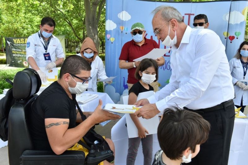 Uzun bir aradan sonra hem açık havada parklara çıkmış olmanın hem de hediye almanın mutluluğu yaşayan çocuklara maske de dağıtıldı.