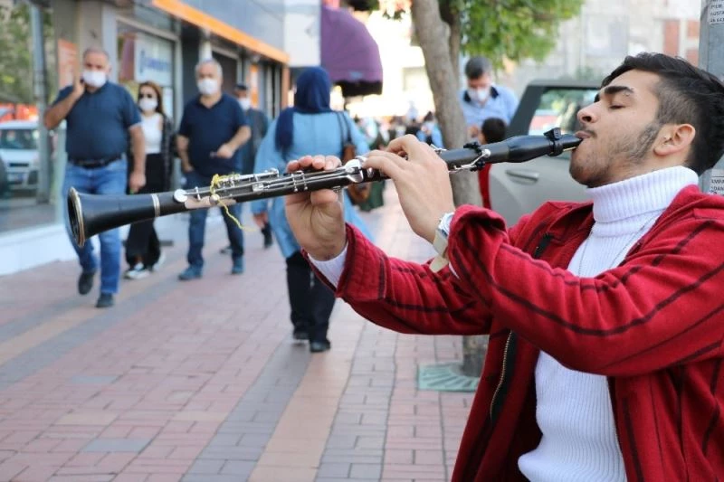 Kent merkezinde müzisyenlik yapan 19 yaşındaki Yılmaz Kurt, pandemiye rağmen sokakta vatandaşlara moral olmaya çalışıyor. Bir taraftan da günlük kazancını sağlayan Kurt, pandeminin insanların psikolojilerini fazlasıyla etkilediğini söyledi. Korona virüs salgınından müzisyenlerin de etkilendiğini belirten Kurt, "Sokak müzisyenliği yapıyorum. Bu işi dört senedir yapıyorum. Pandemi öncesinden bu yana çok değişiklik oldu. Hem keyif hem de ekmek parası için çalıyordum. Şiir, şarkı söylüyorum, klarnet çalıyorum yüzüne bakan yok. İnsanlara moral olmaya çalışıyorum. Kendimiz için de bir şeyler yapıyoruz. Artık ’çal da neşemiz yerine gelsin’ diyen de yok. Bundan 5 ay öncesine kadar böyle söylüyorlardı. Türk Sanat Müziği çalıyorum. Korona virüs herkesi etkiledi" diye konuştu.