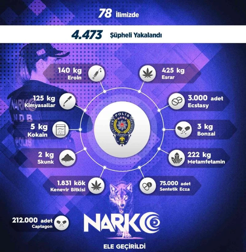 Emniyet Genel Müdürlüğü, uyuşturucu ticaretini önlemeye yönelik 78 ilde düzenlediği sokak operasyonlarında bir hafta içerisinde şüpheli görülen 4 bin 473 kişiye adli işlem uygulandığını açıkladı. Operasyonlarda toplam 140 kilogram eroin, 125 kilo kimyasallar, 5 kilo kokain, 2 kilo skunk, bin 831 kök kenevir bitkisi, 212 bin adet captagon, 425 kilo esrar, 3 bin adet ecstasy, 3 kilo bonzai, 222 kilo metamfetamin, 75 bin adet sentetik ecza maddesi ele geçirildi.